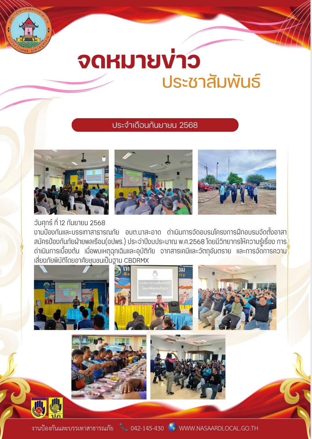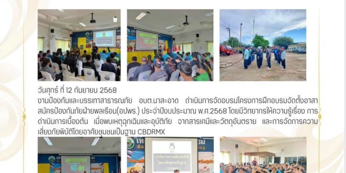 Posted in จดหมายข่าว วันศุกร์ ที่ 12 กันยายน 2568 งานป้องกันและบรรเทาสาธารณภัย อบต.นาสะอาด ดำเนินการจัดอบรมโครงการฝึกอบรมจัดตั้งอาสาสมัครป้องกันภัยฝ่ายพลเรือน(อปพร.) ประจำปีงบประมาณ พ.ศ.2568 ระหว่างวันที่ 11 – 15 กันยายน 2568 โดยมีวิทยากรบรรยาย เรื่องการดำเนินการเบื้องต้น เมื่อพบเหตุฉุกเฉินและอุบัติภัย จากสารเคมีและวัตถุอันตราย และการจัดการความเสี่ยงภัยพิบัติโดยอาศัยชุมชนเป็นฐาน CBDRMX ณ สำนักงานเทศบาลตำบลสร้างคอม อำเภอสร้างคอม จังหวัดอุดรธานี mungmee