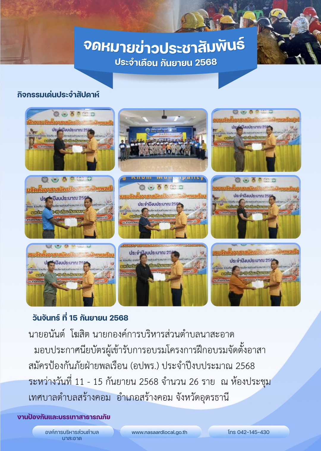 วันที่ 15 กันยายน 2568 นายอนันต์ โฆสิต นายกองค์การบริหารส่วนตำบลนาสะอาด มอบประกาศนียบัตรผู้เข้ารับการอบรม โครงการฝึกอบรมจัดตั้งอาสาสมัครป้องกันภัยฝ่ายพลเรือน (อปพร.) ประจำปีงบประมาณ 2568 ระหว่างวันที่ 11 – 15 กันยายน 2568 มอบให้ผู้เข้าอบรมของตำบลนาสะอาด จำนวน 26 ราย ณ ห้องประชุมเทศบาลตำบลสร้างคอม อำเภอสร้างคอม จังหวัดอุดรธานี →