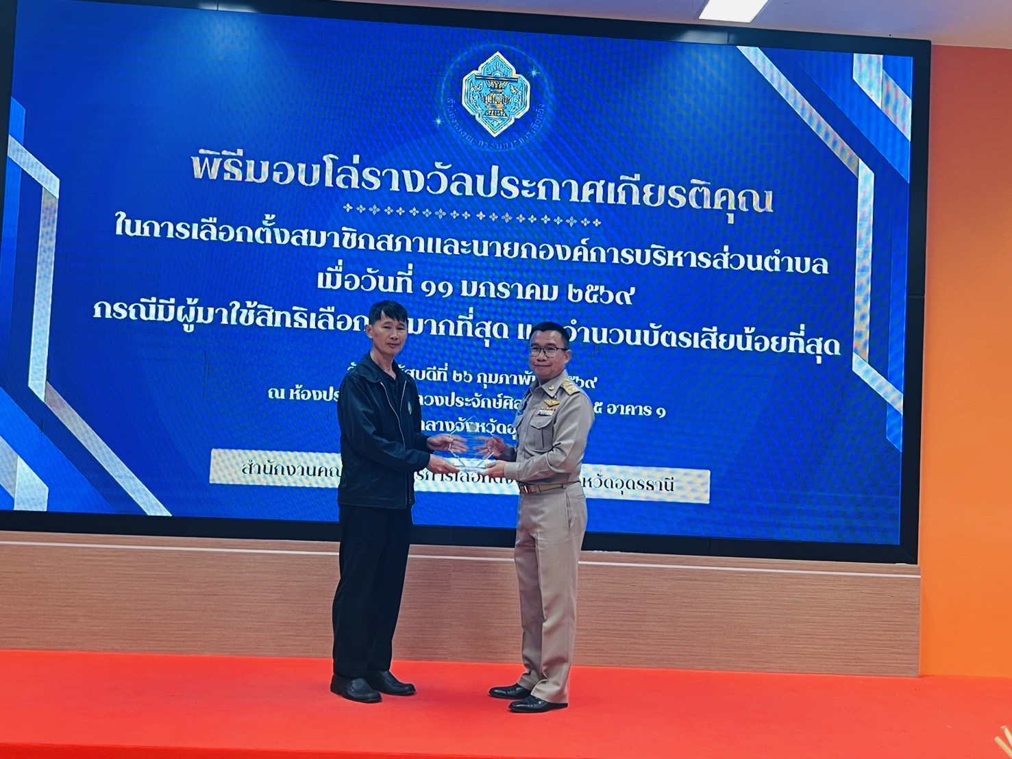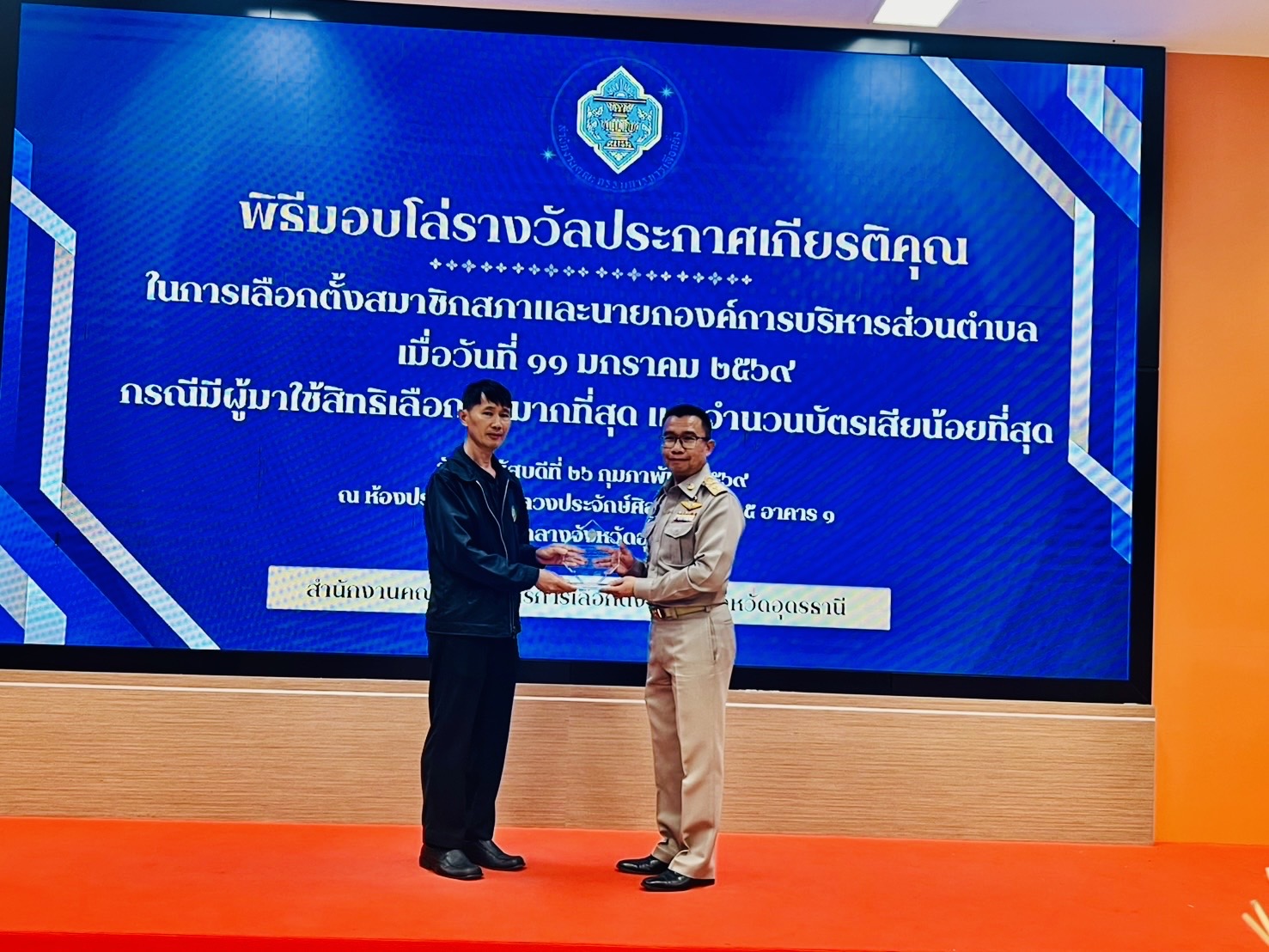 Posted in กิจกรรมและโครงการต่างๆ วันพฤหัสบดี ที่ 26 กุมภาพันธ์ 2569 เวลา 08.30 น. นายนพพล โพนพุฒ ปลัดองค์การบริหารส่วนตำบลนาสะอาด เข้ารับโล่รางวัลปะกาศเกียรติคุณในการเลือกตั้งสมาชิกสภาและนายกองค์การบริหารส่วนตำบลนาสะอาด เมื่อวันที่ 11 มกราคม 2569 กรณีมีผู้มาใช้สิทธิเลือกตั้งมากที่สุด และจำนวนบัตรเสียน้อยที่สุด ณ ห้องประชุมกรมหลวงประจักษ์ศิลปาคม ชั้น 5 อาคาร 1 ศาลากลางจังหวัดอุดรธานี mungmee