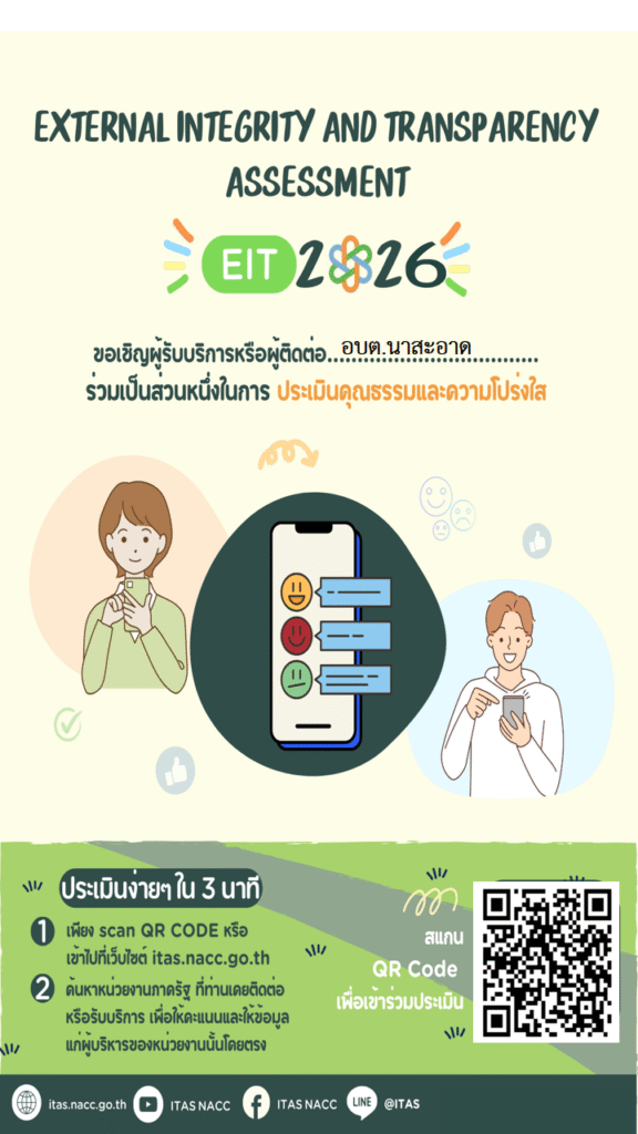 วันพฤหัสบดี ที่ 26 กุมภาพันธ์ 2569 เวลา 08.30 น. นายนพพล โพนพุฒ ปลัดองค์การบริหารส่วนตำบลนาสะอาด เข้ารับโล่รางวัลปะกาศเกียรติคุณในการเลือกตั้งสมาชิกสภาและนายกองค์การบริหารส่วนตำบลนาสะอาด เมื่อวันที่ 11 มกราคม 2569 กรณีมีผู้มาใช้สิทธิเลือกตั้งมากที่สุด และจำนวนบัตรเสียน้อยที่สุด ณ ห้องประชุมกรมหลวงประจักษ์ศิลปาคม ชั้น 5 อาคาร 1 ศาลากลางจังหวัดอุดรธานี26 กุมภาพันธ์ 2569